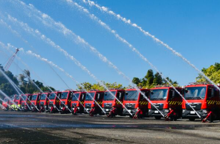 在行車與操作安全方面,新購消防車底盤全面導入多項主、被動安全與行車控制系統,並增設行車視野輔助、盲區警示、車身高辨識反光標示及歐規警示燈等裝置,大幅提升緊急出勤行車安全。同時依使用單位實務需求,升級配置幫浦穩壓裝置、電子水位顯示系統及電動油壓開門器等設備,使車輛在高強度救災環境下仍能維持穩定運作、迅速反應,確保分秒必爭的救災任務安全可靠。